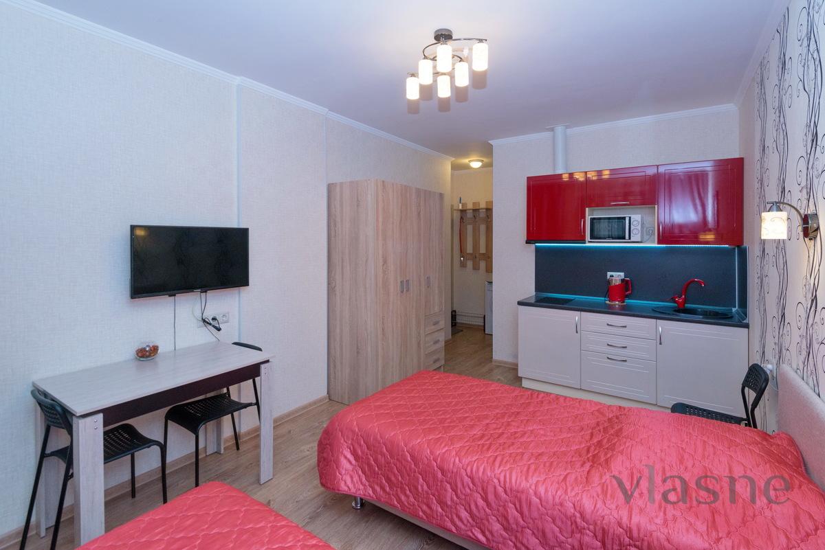 One-room double apartment with a kitchen, with two single beds or with one double bed (180x200). We offer our guests a stunning cozy studio with all amenities. Available: - hot and cold water - separate bathroom with toilet - washing machine - hairdryer - kitchen with household appliances - refrigerator - dishes - TV - iron - ironing board WI FI Near restaurants, cafes, a movie theater and shops.