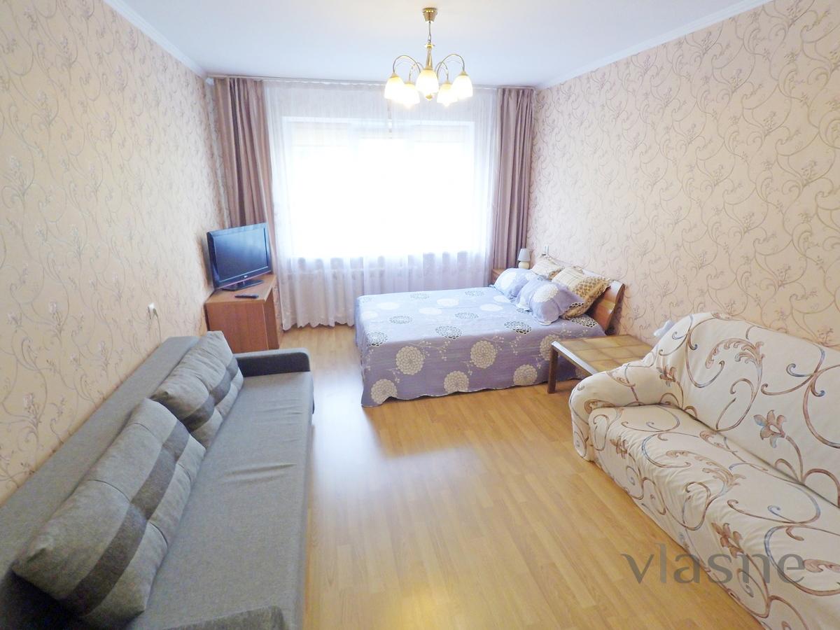 "Business Class". Excellent repair, heating, all the furniture: kitchen, closet, twin and double beds, sofa, sofas, appliances: TV, Internet (wi-fi), refrigerator, washing machine, gas stove, telephone, microwave oven and all amenities : district heating, a bathroom in a tile, glazed balcony, bedding, linens, dishes, floors - laminate and tile, window-pane windows, look into the yard, smoking only on the balcony (glazed).