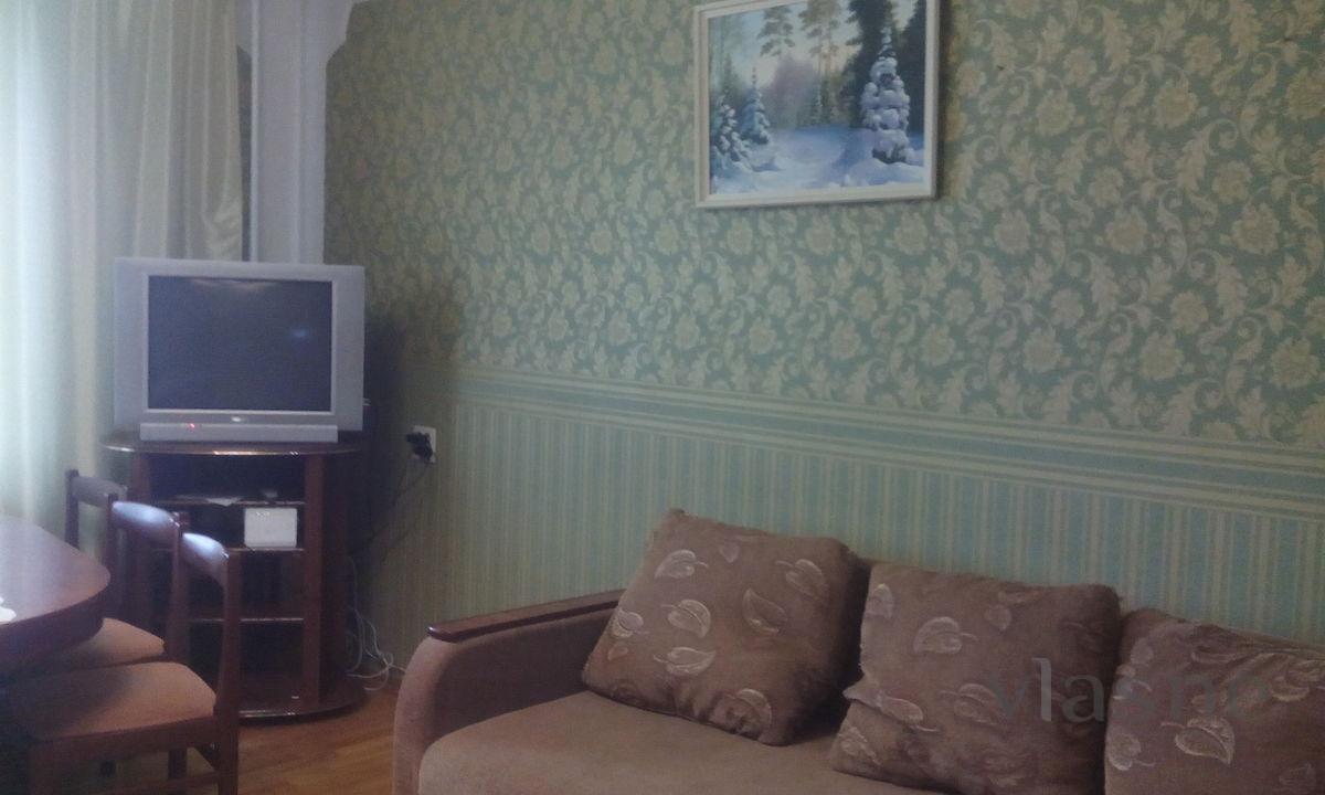 Спальня: двух-спальный диван, кресло, тумба под ТВ и телевизор, стол.