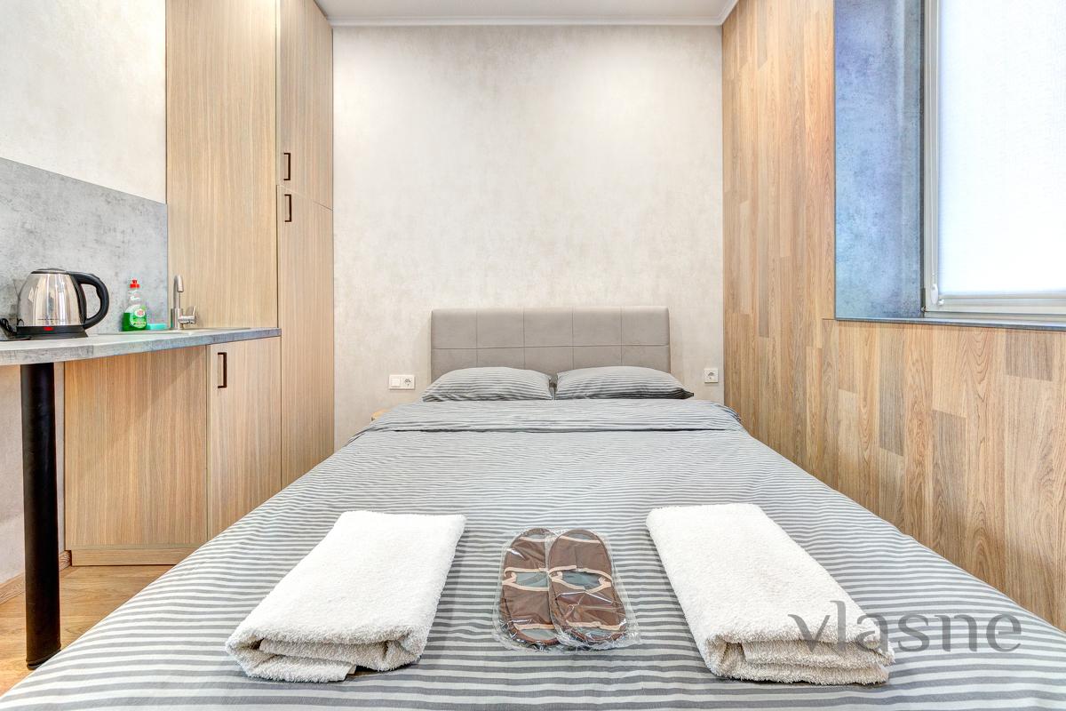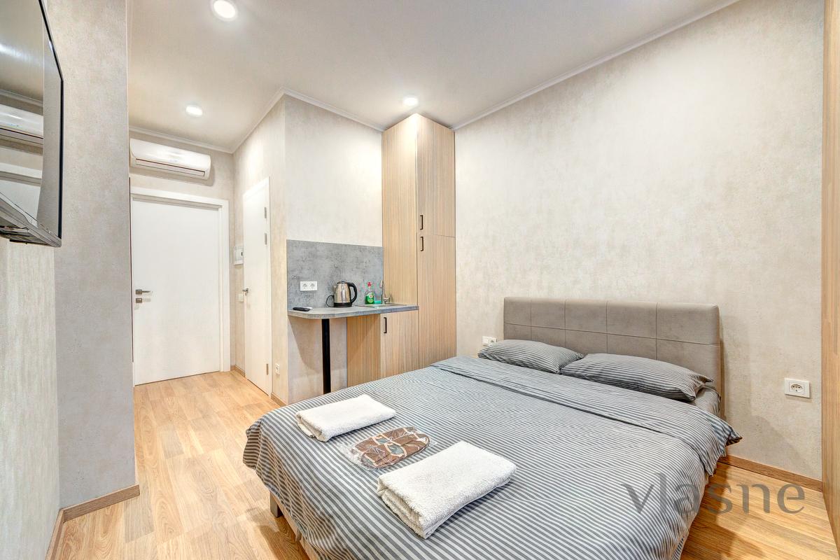Daire şu adreste yer almaktadır: Beresteysky Caddesi, 1, Vokzalna metro istasyonu (yürüyerek 10 km). Yakınlarda yürüme mesafesinde: "Ukrayna Mağazası" alışveriş merkezi, restoranlar, kafeler, "Nova Poshta" şubesi ve "Varus" süpermarketi. Tek odalı daire yakın zamanda yenilenmiş, açık renkler ve ergonomik mobilyalarla dekore edilmiştir.