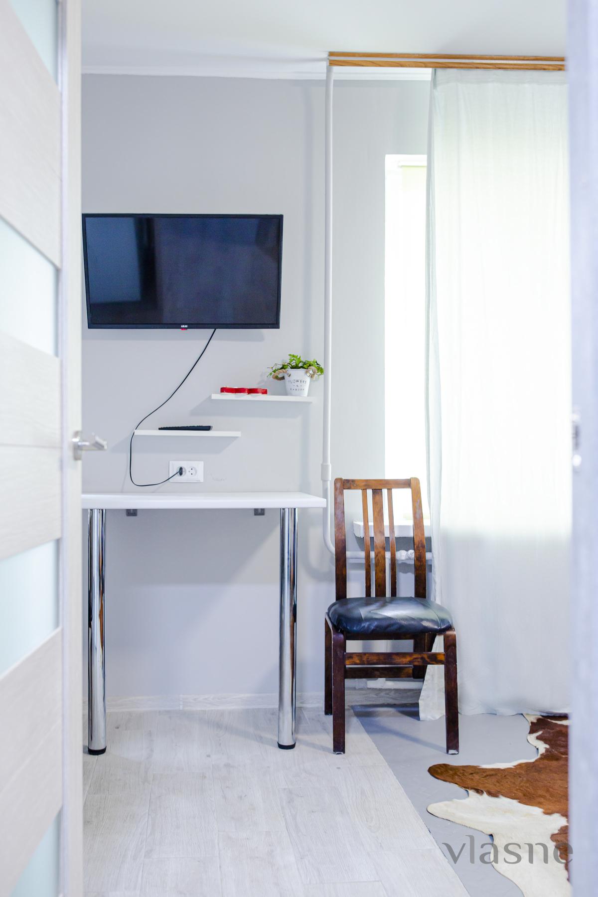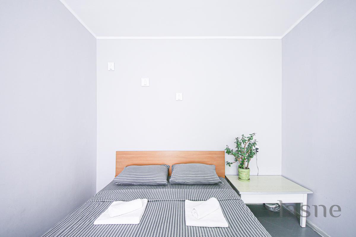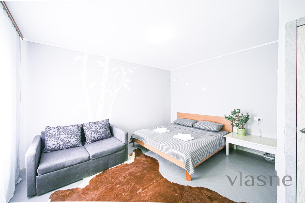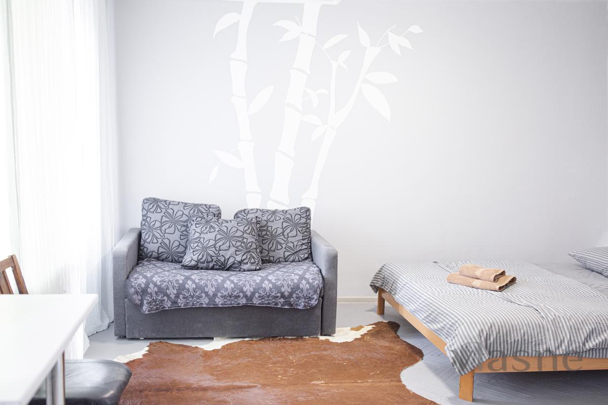 The middle of the apartment is light and quiet, with spacious divisions into the kitchen, bedroom and maintenance area. The kitchen set is in beige color, the countertop is white. And all the necessary household appliances: refrigerator, stove, oven and kettle. The room is decorated in a pastel gray color with an accent wall depicting a white bamboo stem. In the bedroom area there is a double bed with an orthopedic mattress and a small table. The finishing area has a neat sofa (folding), a set of soft chairs, a living table with chairs, and a TV is installed for reception. The bathroom is decorated with white and cream colored tiles. In the middle there are: a bathtub, a toilet, a washbasin with a mirror, a dryer for towels and a washing machine. Availability of renting an apartment on the weekend - check the phone number! Book whenever the time is right for you!