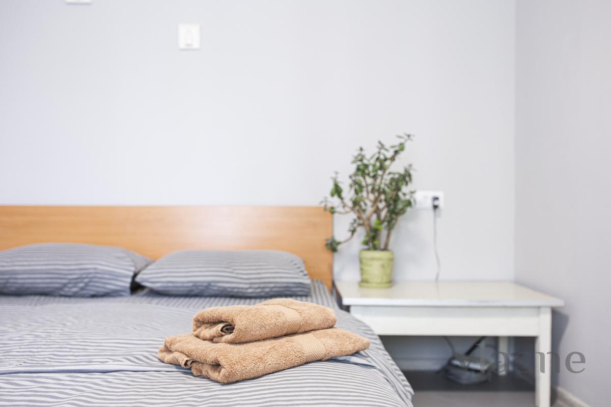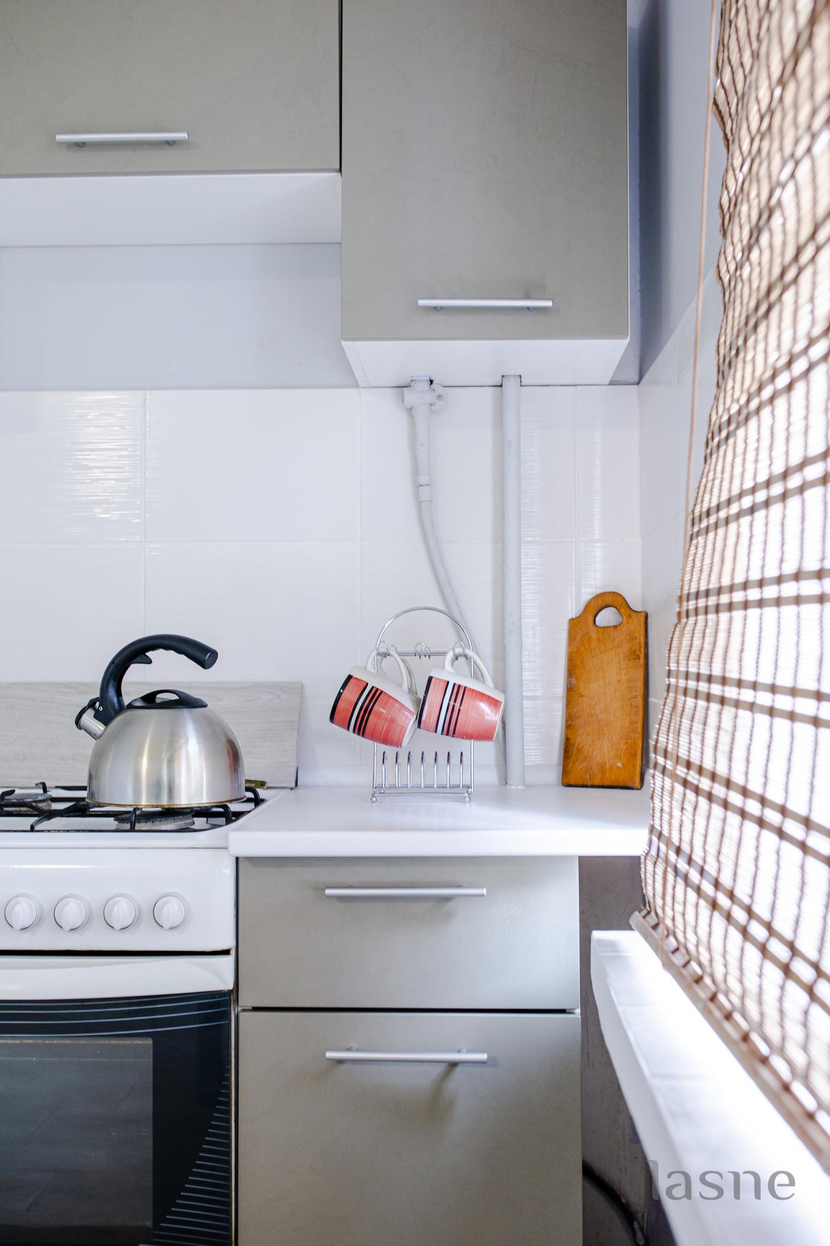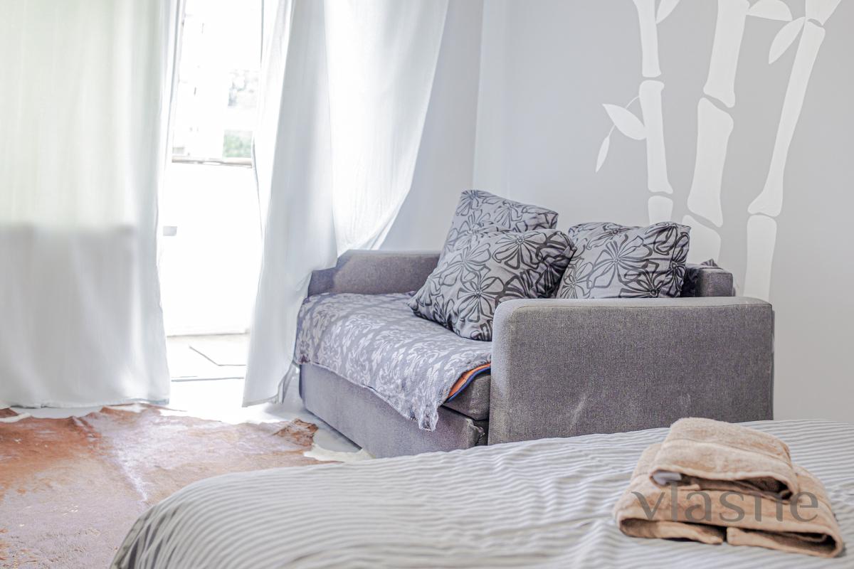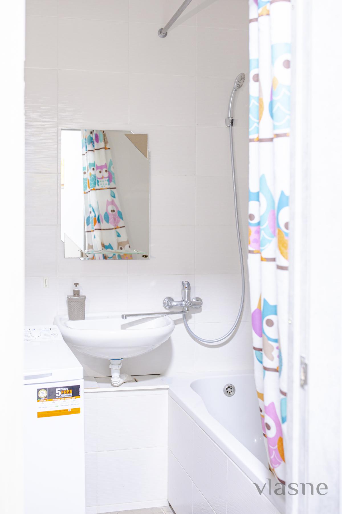 The middle of the apartment is light and quiet, with spacious divisions into the kitchen, bedroom and maintenance area. The kitchen set is in beige color, the countertop is white. And all the necessary household appliances: refrigerator, stove, oven and kettle. The room is decorated in a pastel gray color with an accent wall depicting a white bamboo stem. In the bedroom area there is a double bed with an orthopedic mattress and a small table. The finishing area has a neat sofa (folding), a set of soft chairs, a living table with chairs, and a TV is installed for reception. The bathroom is decorated with white and cream colored tiles. In the middle there are: a bathtub, a toilet, a washbasin with a mirror, a dryer for towels and a washing machine. Availability of renting an apartment on the weekend - check the phone number! Book whenever the time is right for you!