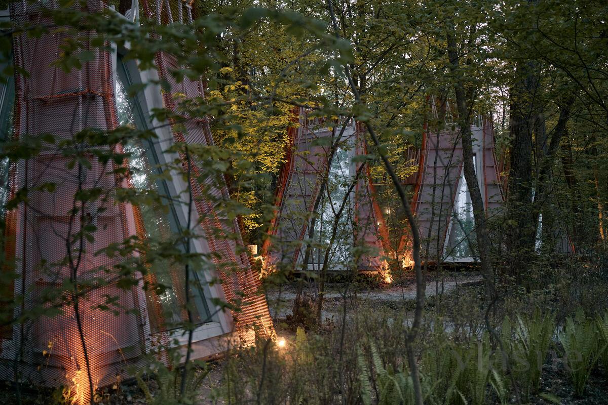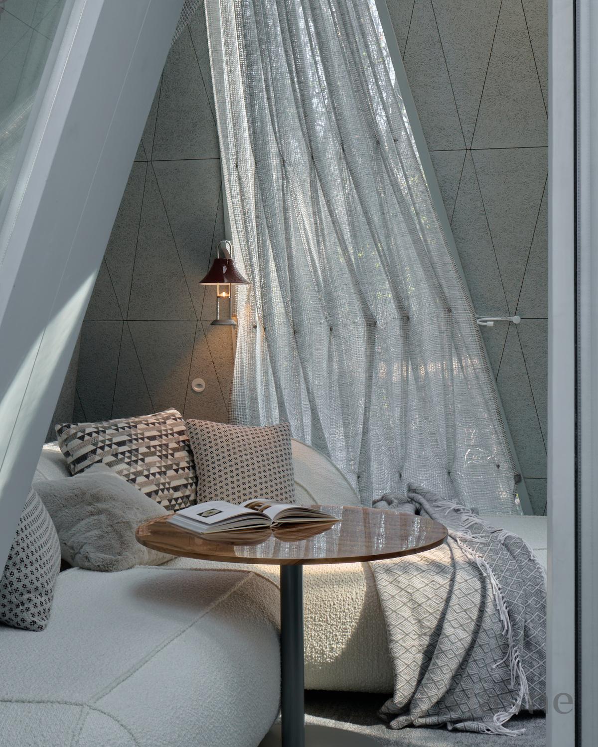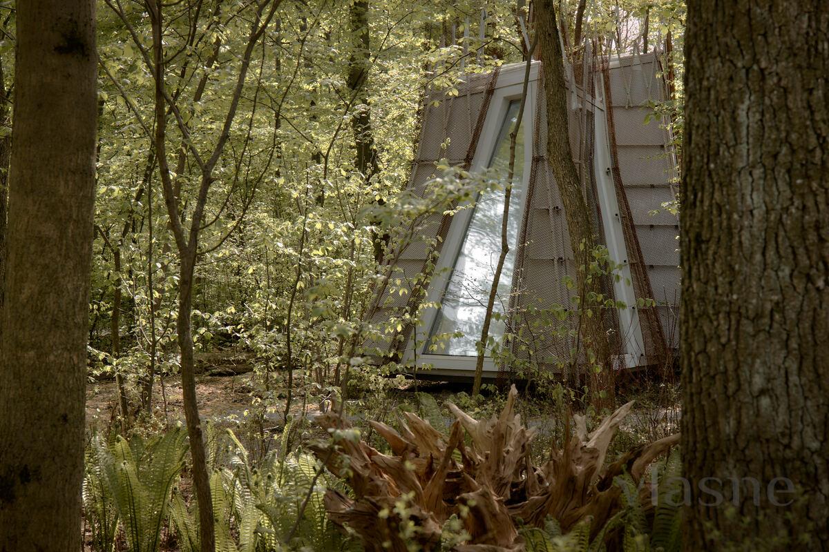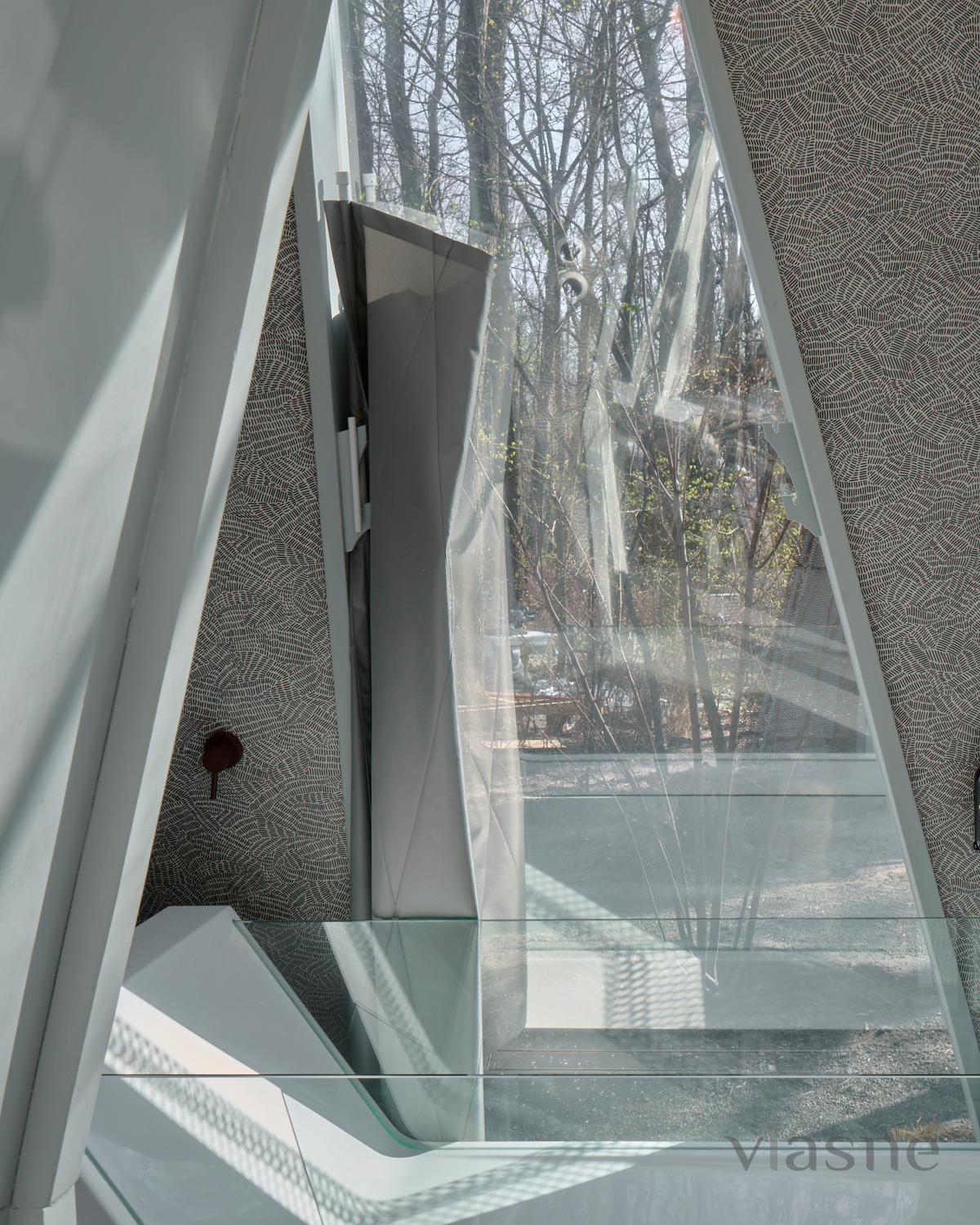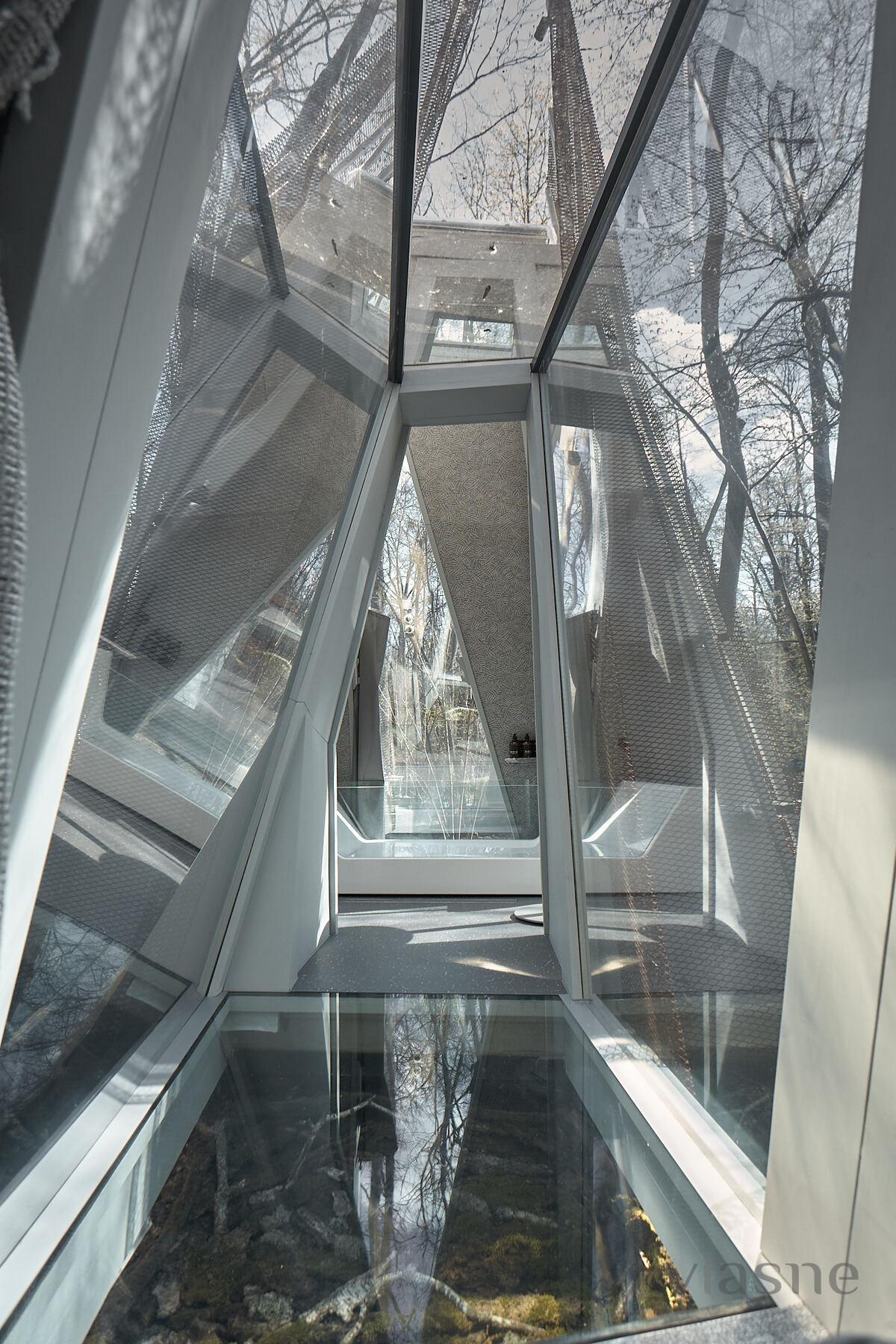 Duvarlar yerine kullanılan pencere fenerleri sonsuz bir alan hissi yaratarak odadan gökyüzünün muhteşem manzaralarını görmenizi sağlıyor. Özellikle odalar arasında dolaştığınız geçitler düşmancadır; böyle anlarda sanki küçük ev ile orman arasındaki sınırlar siliniyormuş gibi hissedersiniz ve doğayla tam anlamıyla çelişirsiniz.