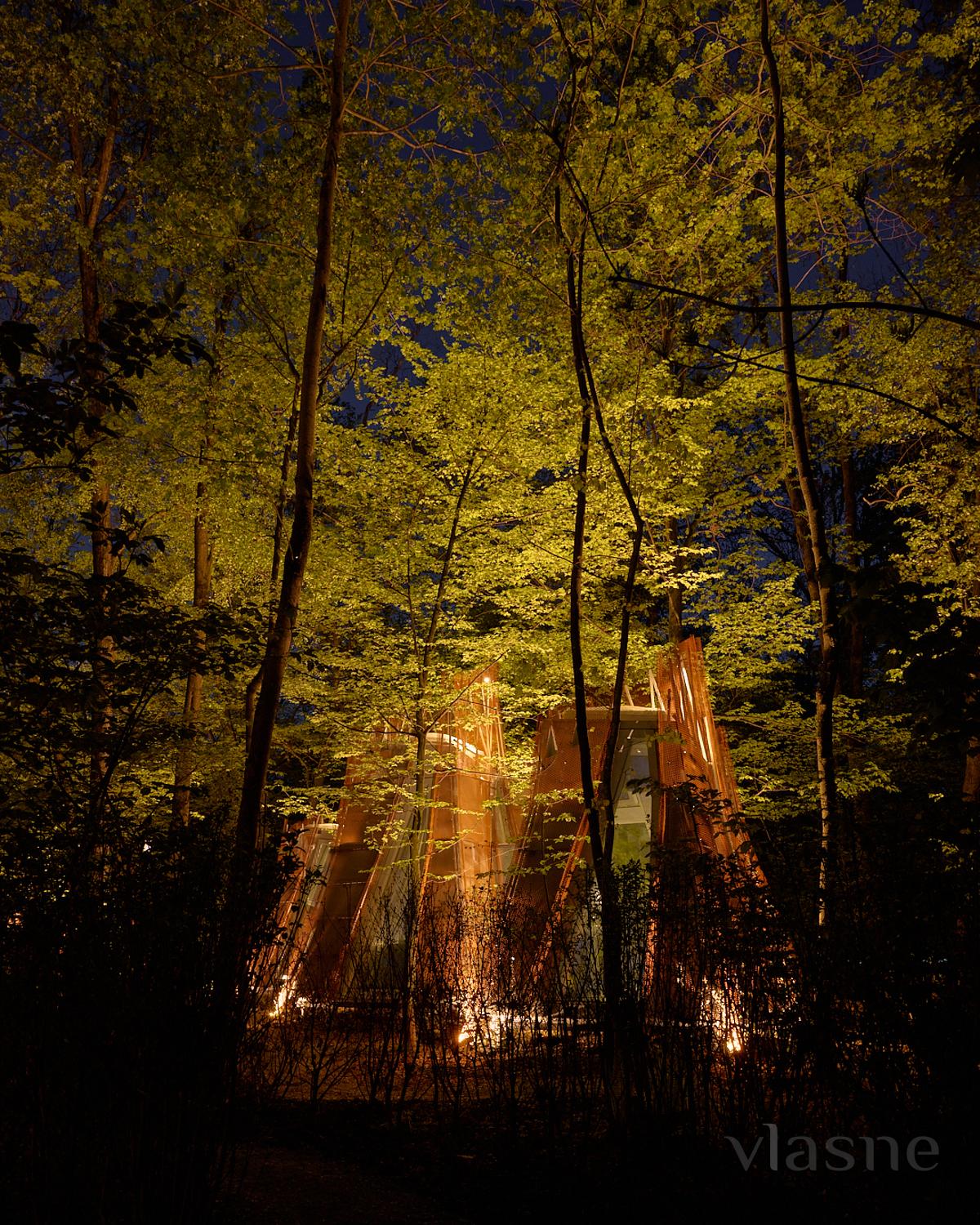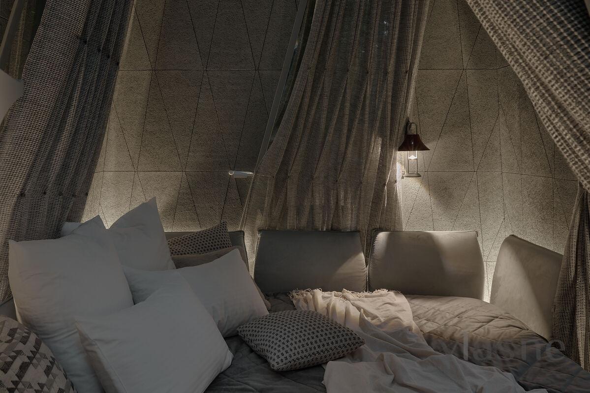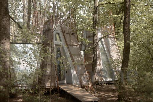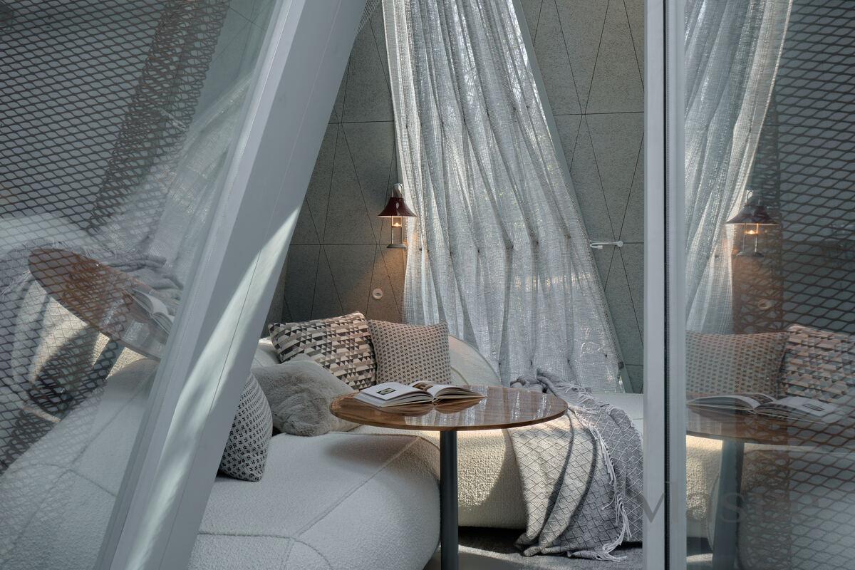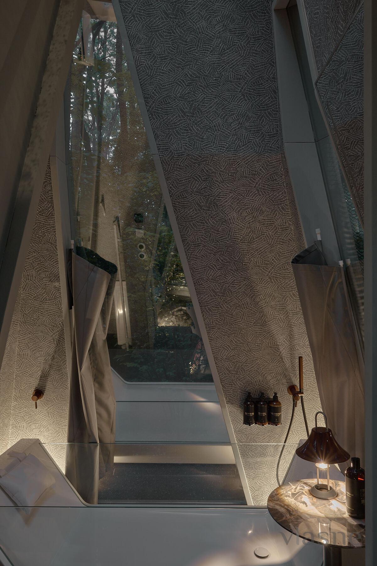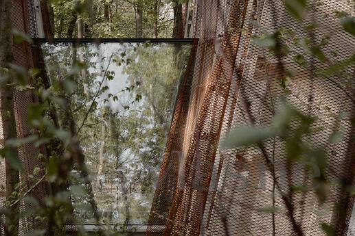 Duvarlar yerine kullanılan pencere fenerleri sonsuz bir alan hissi yaratarak odadan gökyüzünün muhteşem manzaralarını görmenizi sağlıyor. Özellikle odalar arasında dolaştığınız geçitler düşmancadır; böyle anlarda sanki küçük ev ile orman arasındaki sınırlar siliniyormuş gibi hissedersiniz ve doğayla tam anlamıyla çelişirsiniz.