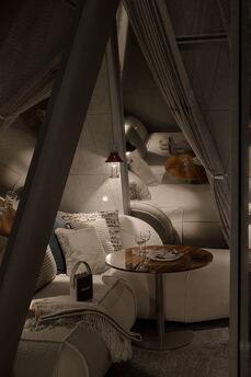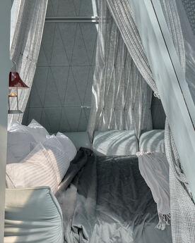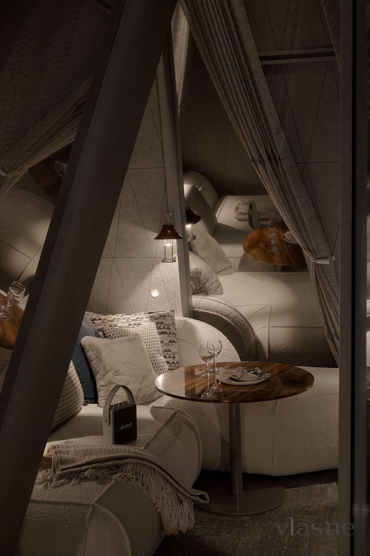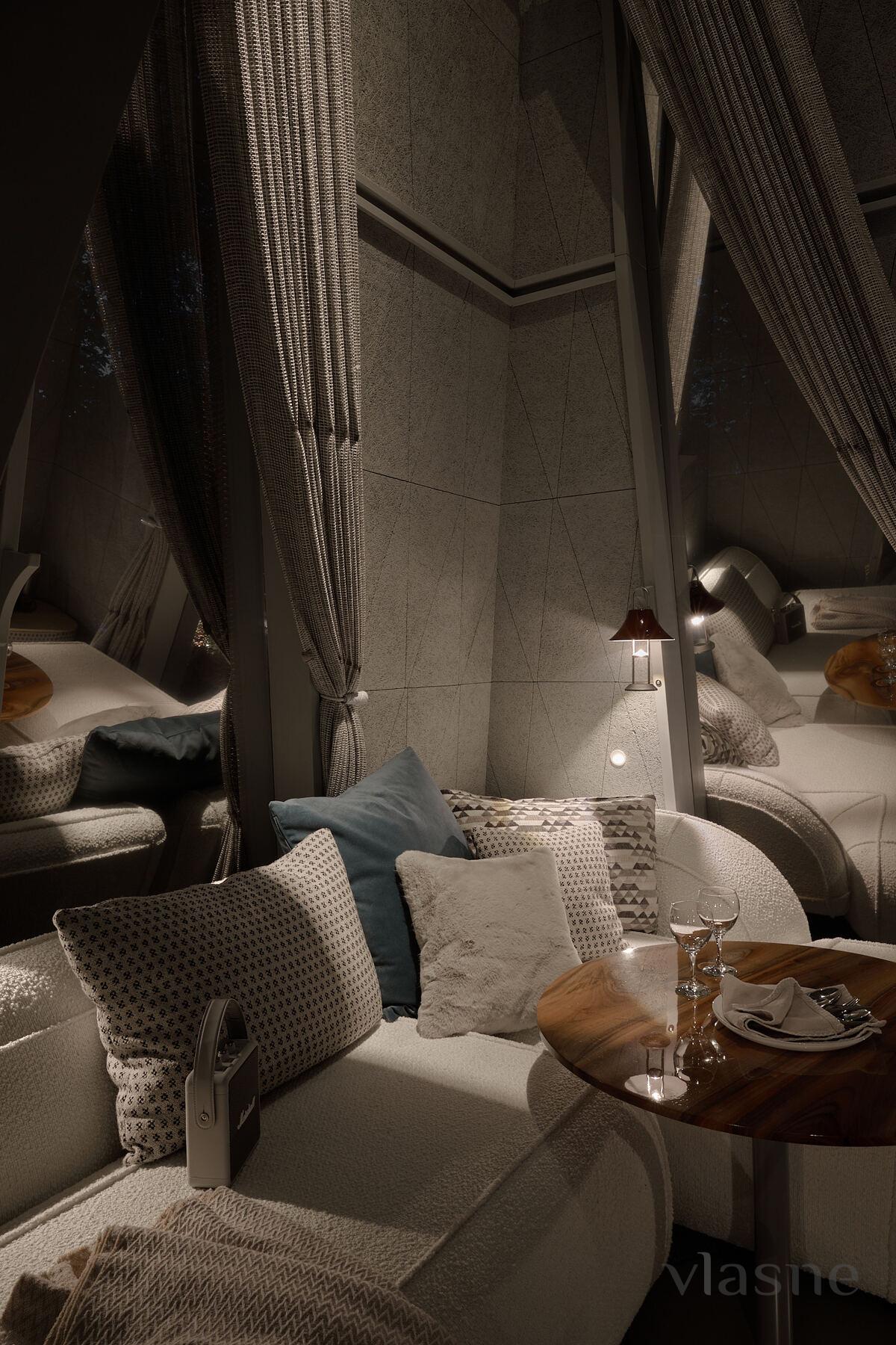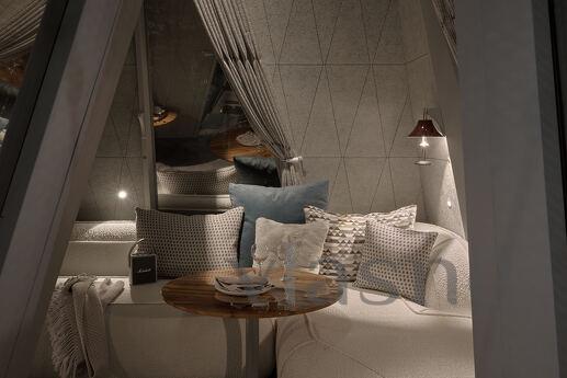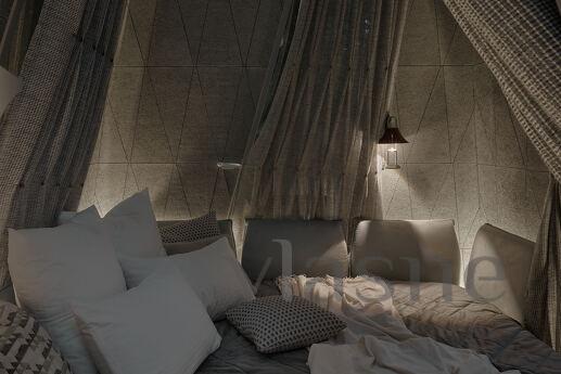 Budinochok “Kış” - glamping Namety için yardım! Pavyonlarımızın en büyüğü olan bu oda (45 m²), size huzur, konfor ve eşsiz bir estetik görünüm kazandırmak için yaratılmıştır. Küçük evimizin derisi kaderin gözeneklerinden esinlenerek tasarlanmış, kendine özgü bir stile sahiptir. Alt kış renkleriyle dekore edilen “Kış” kabininde, sakin bir oturma odası, bir yatak odası, geniş bir oturma odası, duş odası ve ormanın panoramik manzarasına sahip bir banyo bulunmaktadır.